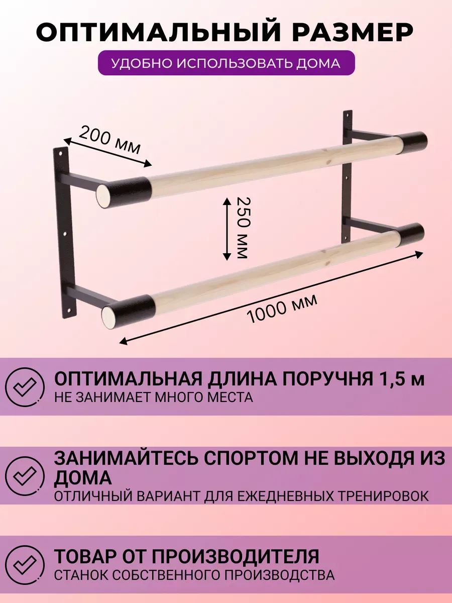 Разная высота поручней позволяет адаптировать станок под индивидуальные параметры детей и взрослых, и обеспечивает поддержку и безопасность при тренировках.