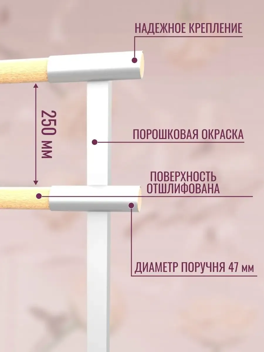 Устойчивая основа позволяет использовать изделие на любом полу, не повреждая покрытие. Круглые деревянные рейки покрыты прозрачным лаком "Балет" и тщательно отшлифованы. После такой обработки поверхность остается абсолютно гладкой — без риска получить занозу. Стойки покрыты порошковой окраской белого цвета, что обеспечивает их стойкость.