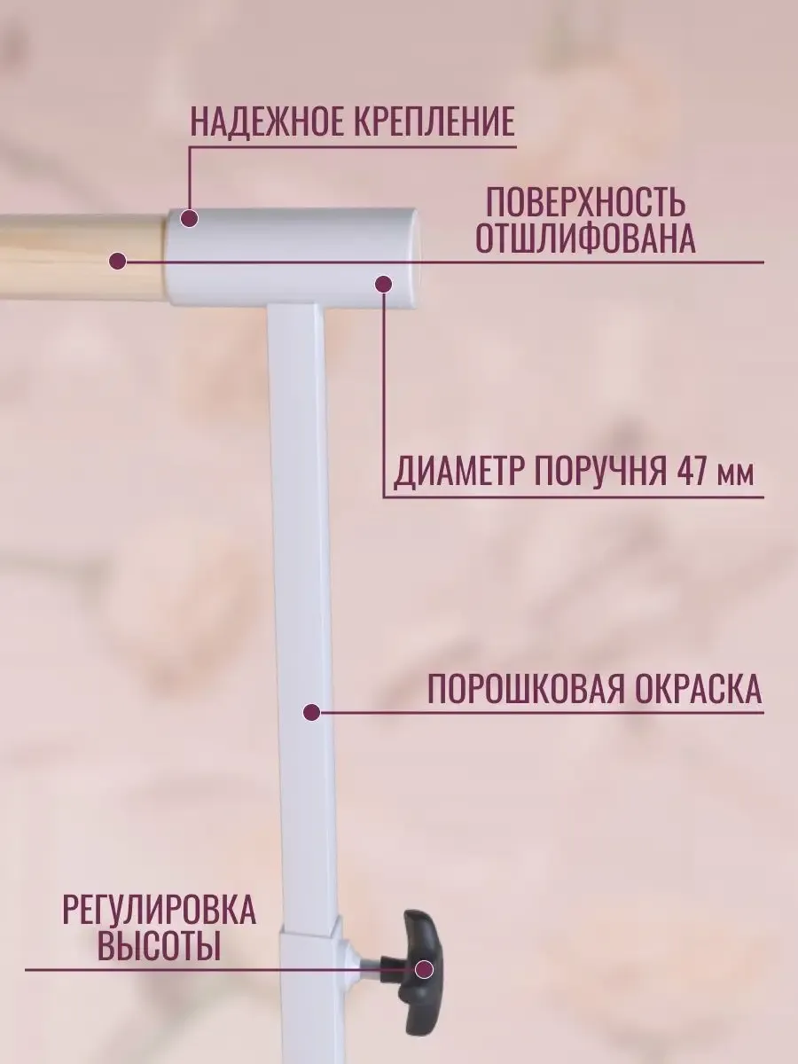 Устойчивая основа позволяет использовать изделие на любом полу, не повреждая покрытие. Круглые деревянные рейки покрыты прозрачным лаком и тщательно отшлифованы. После такой обработки поверхность остается абсолютно гладкой — без риска получить занозу. Стойки покрыты порошковой окраской белого цвета, что обеспечивает их стойкость. Высота поручня регулируется от 70 до 110 см, что позволяет заниматься как детям, так и взрослым с разным уровнем физической подготовки и ростовой группой.