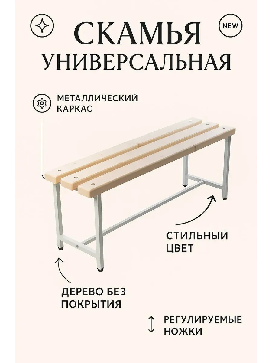 Лавочка станет незаменимой в дачный сезон: на ней удобно сидеть на участке в тени деревьев. Изготовленная из натурального массива дерева, она прекрасно подойдет для бани и сауны. Лавка дополнена регулируемыми черными ножками из металла, что делает ее устойчивой как для дома, так и для улицы. Дизайн в стиле лофт прекрасно вписывается в интерьер банного комплекса. Ее можно поставить в раздевалку, на террасу у бассейна или даже на кладбище.